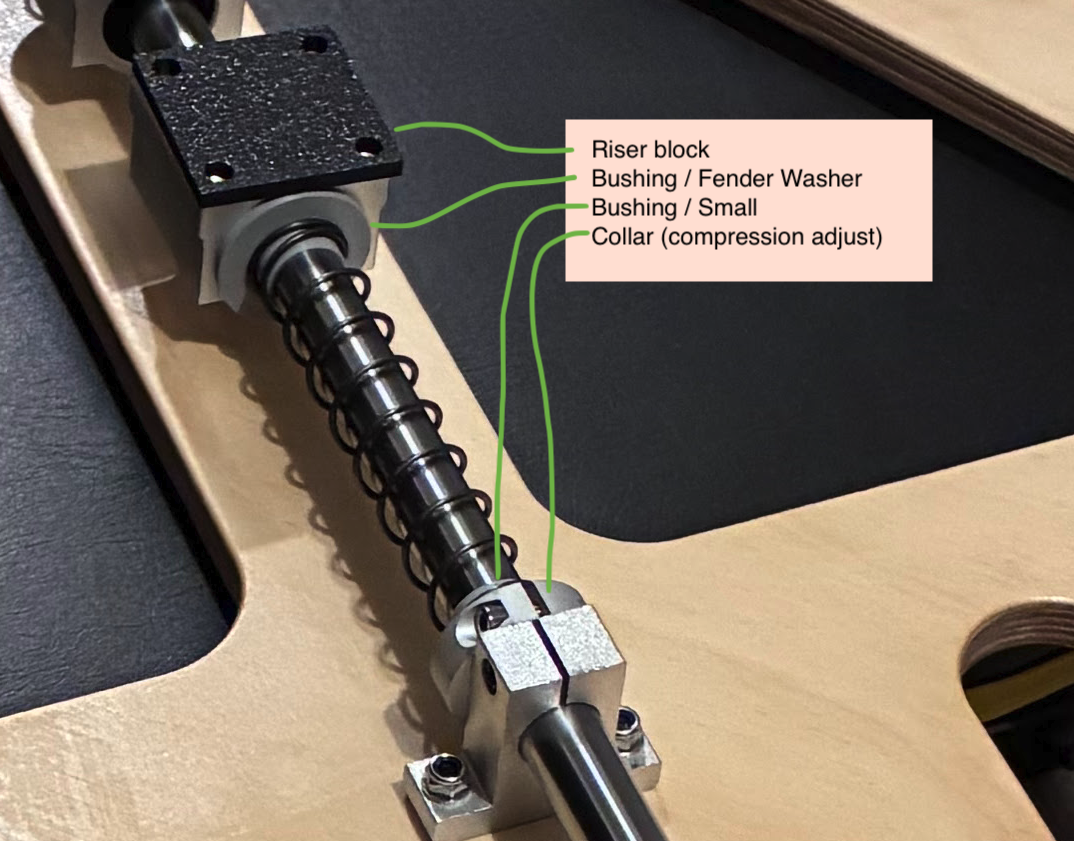 Two interesting observations. 1) We have collars on the smooth rod to adjust the spring tension, as needed. 2) I 3d printed some PETG bushings for the spring. There's fender washer sized bushing on the bearing face, and a small bushing on the support block face.